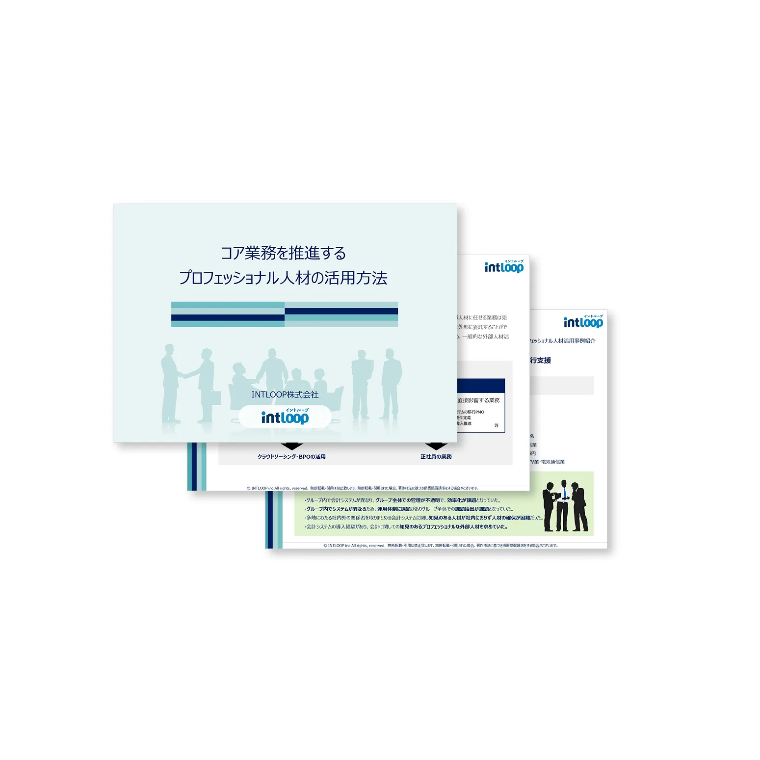 プロフェッショナル人材の活用方法INTLOOPではコア業務こそ外部人材(プロフェッショナル人材)を活用すべきだと考え、その活用メリットと活用事例を本資料にまとめました。