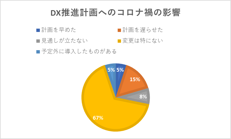 「DX推進計画へのコロナ禍の影響の有無」を聞いたところ、全体の67%が「計画の変更は特にない」と回答し、「計画を早めた」という回答も5%ありました。一方で、「計画を遅らせた」という回答が15%、「見通しが立たない」という回答も8%あり、今回のコロナ禍の影響を受けてDX推進が難しくなった企業と、影響を受けずにデジタル技術を活用した全社改革、業務改革を進められている企業との差が明確に分かれている現状が明らかになりました。