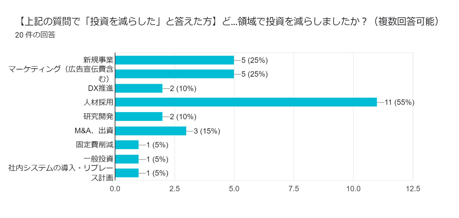 投資を減らした企業も19.8%おり、投資を減らした領域としては「人材採用領域」が最も多く55%となり、次いで「新規事業」と「マーケティング(広告宣伝費含む)」がともに25%、「M&A、出資」が15%という回答となりました。