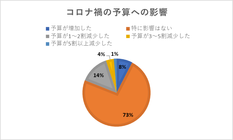 企業の「新型コロナウイルスの情報システム部門の予算への影響」について尋ねたところ、「特に影響はない」と答えた企業が最も多く、73.4%が「影響がない」と回答しました。昨今の状況下でも「予算が増加した」という企業も7.6%存在している一方で、「予算が1~2割減少した」企業が13.9%、「予算が3~5割減少した」企業も3.8%の回答があり、情報システム部門の予算への影響も企業によって対応の差がはっきりと分かれていることがデータから明らかになりました。