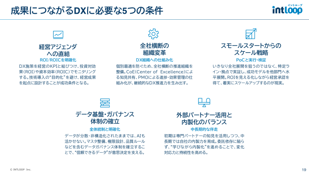 岡村は、PoC(概念実証)止まりや部分最適に陥らず、DXを成果へ導くための要諦として以下の5項目を提示しました。