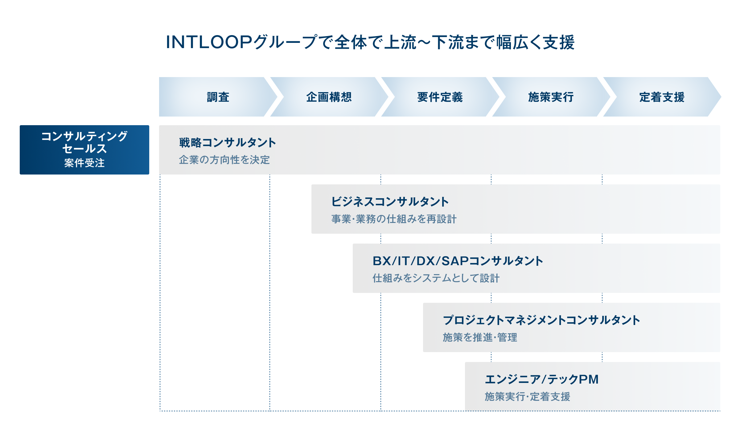INTLOOPは、コンサルティング・人材ソリューション・テクノロジーの3事業を軸に、 企業の課題解決を構想から実行まで一気通貫で支援するコンサルファームです。