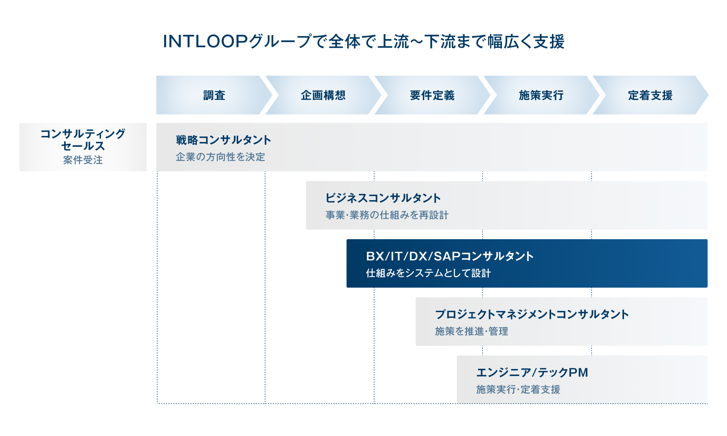 この仕組みにより、DX構想、基幹システム刷新、大規模PM/PMOなどエンタープライズ案件にも若手から挑戦できる機会があります。階層ごとに役割が決まりやすい大手ファームとは異なり、INTLOOPでは手を挙げた人から幅広い役割に挑戦できるのが特徴です。