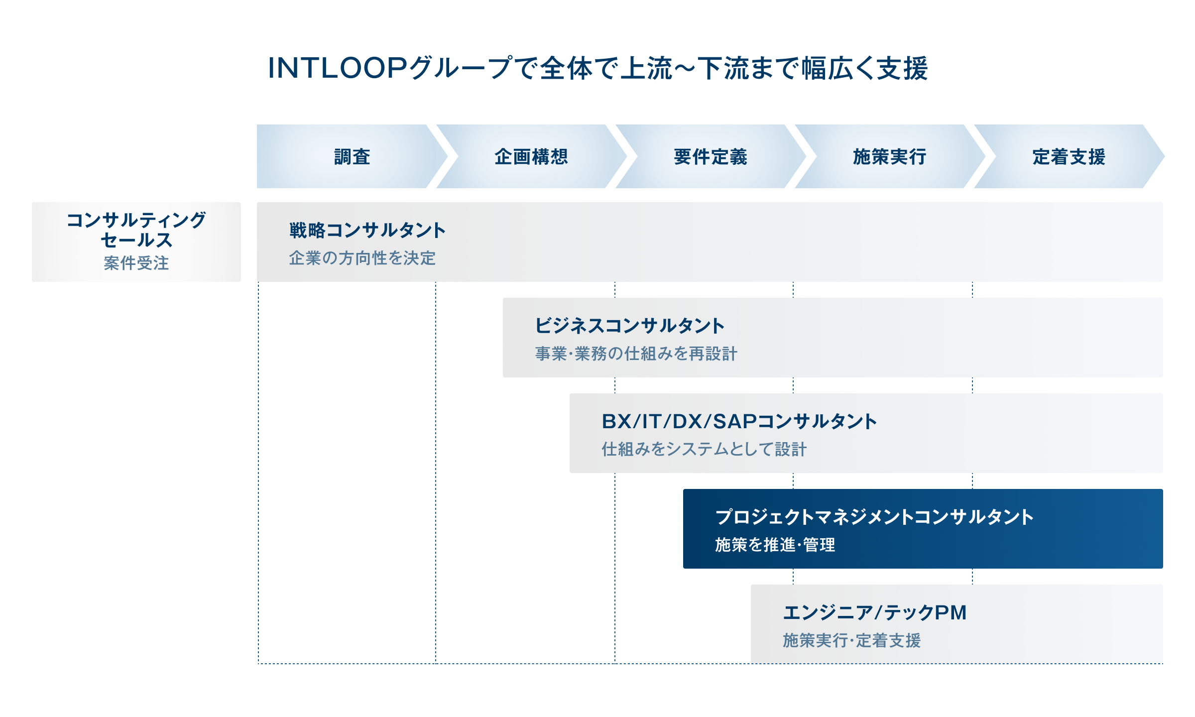 企業のプロジェクトを成功に導くために、計画立案から実行・管理までを担います。配属は、プロジェクトマネジメントに特化した専門会社「INTLOOP Project Management株式会社」となります。